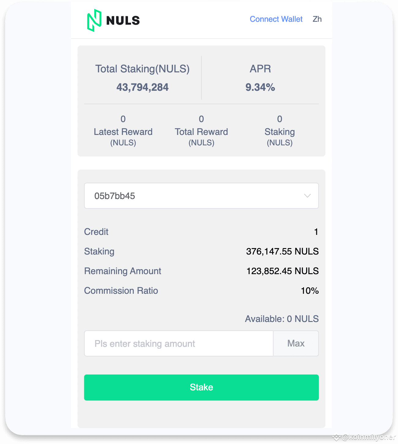Our award-winning Proof of Credit (PoC) consensus mechanism secures the NULS network by combining Delegated Proof of Stake with an added credit rating feature. Earn NULS by staking into a node or operating a NULS master node. A user who earns rewards by delegating their NULS into a NULS node, the node owner shares 10% of the user's total earnings as commission.