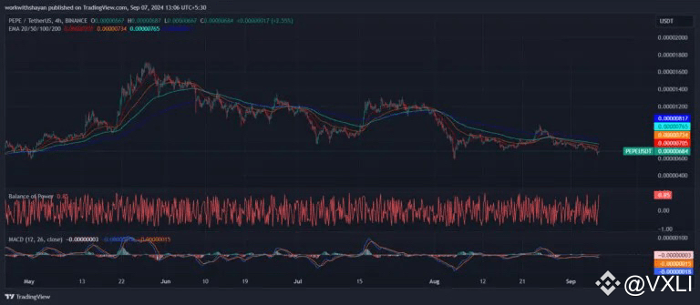 The 4-hour Pepe price chart suggests that bears are increasing their domination near the immediate support line as PEPE price aims for further declines. Bulls are currently aiming for a hold above the EMA20 trend line.