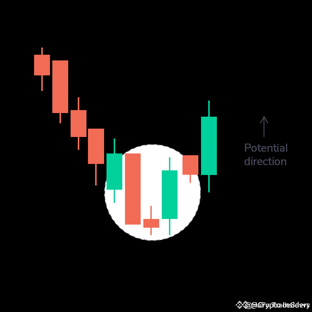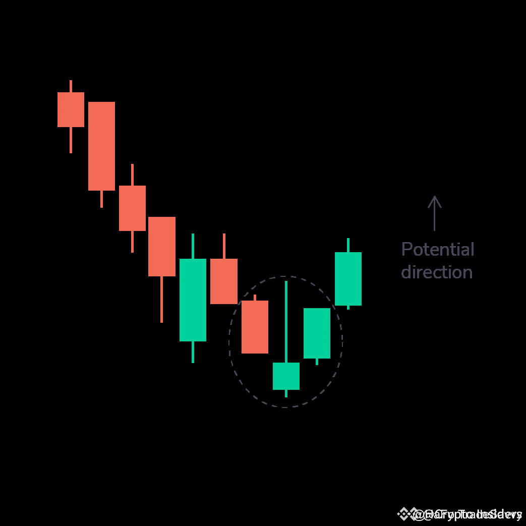 Đây là mô hình ba nến có một nến với thân ngắn nằm giữa một nến đỏ dài và một nến xanh dài. Thường không có sự chồng chéo giữa nến ngắn và nến dài. Đây là dấu hiệu cho thấy áp lực bán giảm và thị trường tăng giá bắt đầu.