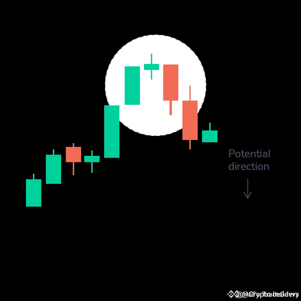 Đây là mô hình ba nến có một nến có thân ngắn nằm giữa một nến đỏ dài và một nến xanh dài. Thường không có sự chồng chéo giữa nến ngắn và nến dài. Đây là dấu hiệu đảo ngược xu hướng tăng. Điều này có ý nghĩa hơn nếu nến thứ ba vượt qua mức tăng của nến đầu tiên.