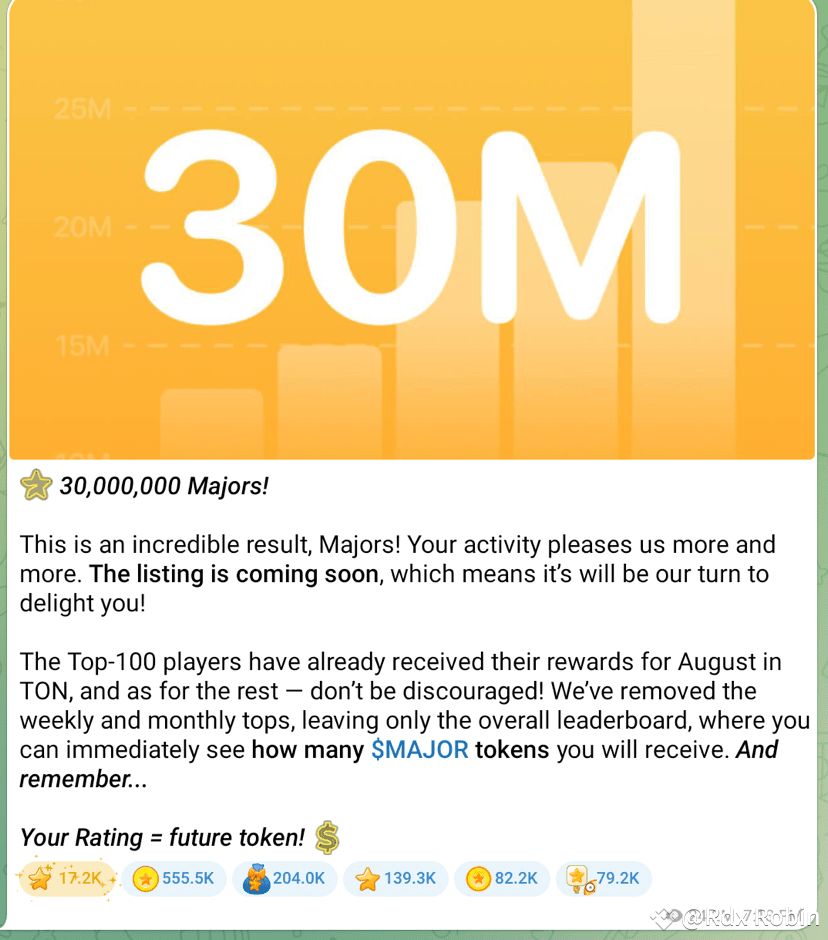 The Major Coin team has clarified that the top 100 players have already received rewards in TON (The Open Network). However, the actual listing will mark the point when users can convert their accumulated ratings into $MAJOR tokens.