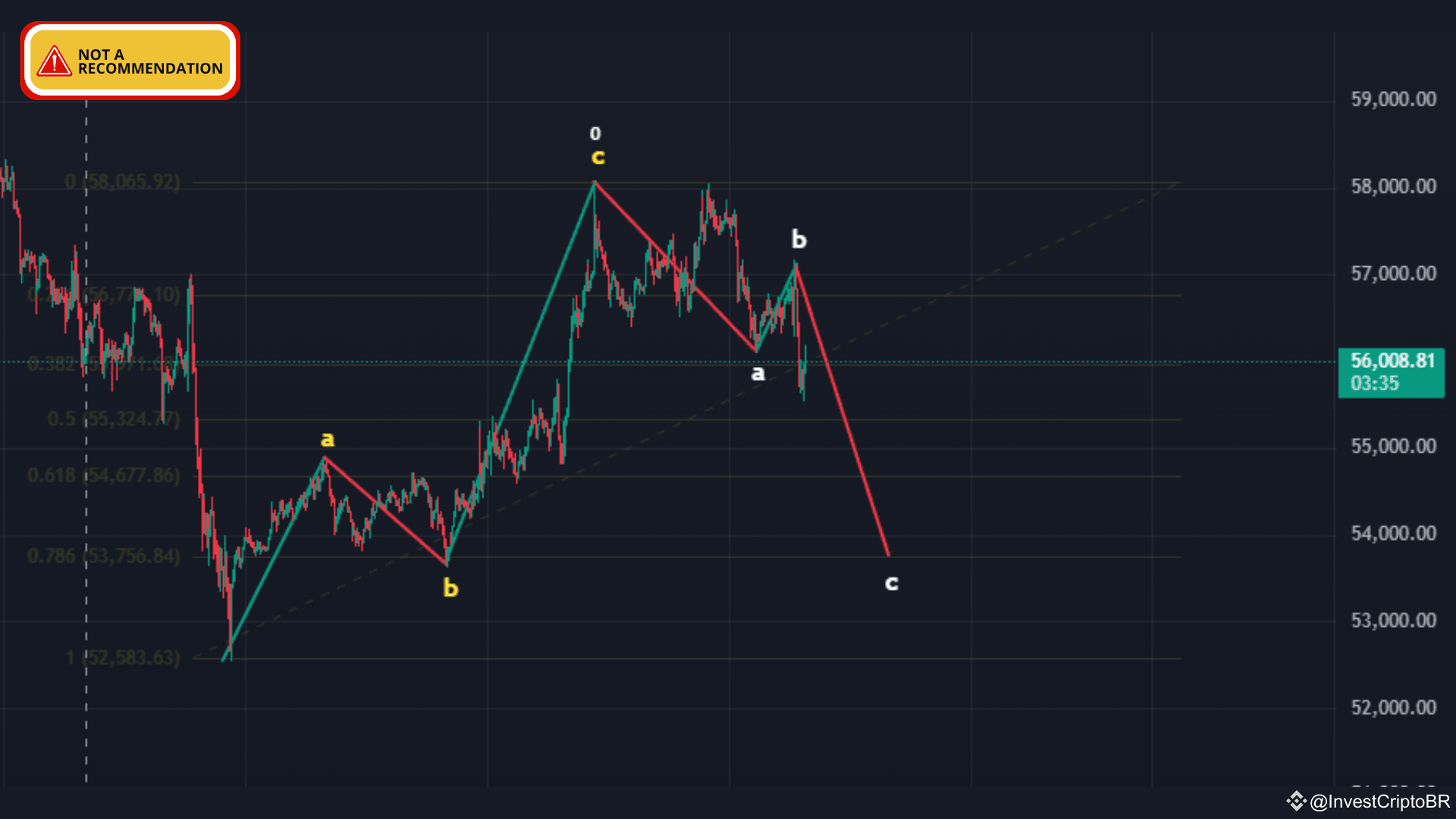Estamos em um padrão ABC de alta, que pode ser seguido por um ABC corretivo. Esse movimento pode resultar na formação de um novo fundo na região de 52.500, fechar o gap do CME ou, no pior cenário, estabelecer um novo fundo majoritário abaixo de 49.000, possivelmente na faixa de 46.000. Esse ABC corretivo poderia ser seguido por uma nova onda de impulso de 5 ondas para cima.