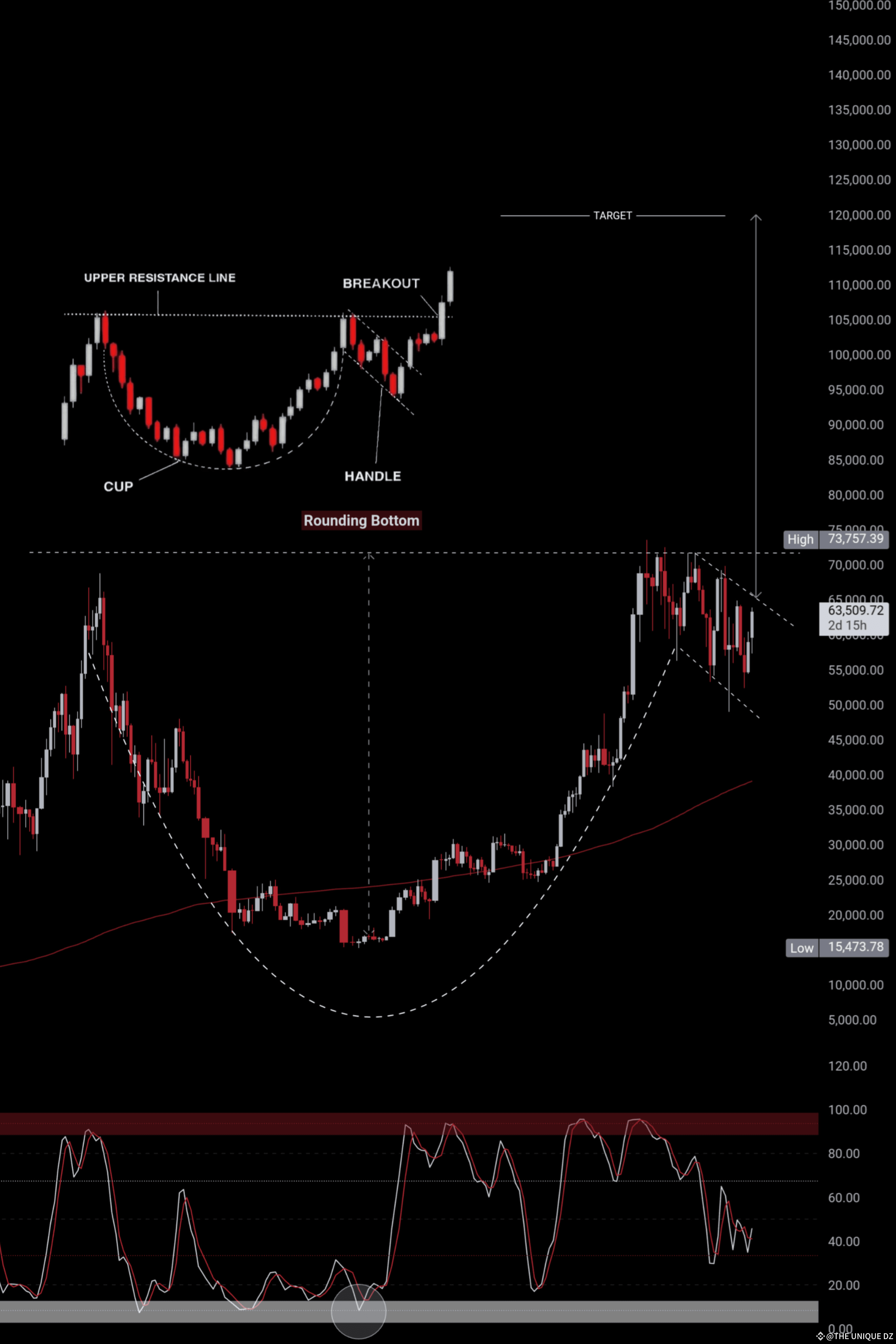 بعد تشكيل القاعدة الرابعة، يتوقع ارتفاع جديد نحو $120,000، ولكن يجب الحذر من حدوث تصحيح حاد قد يكون بداية السوق الهابط.