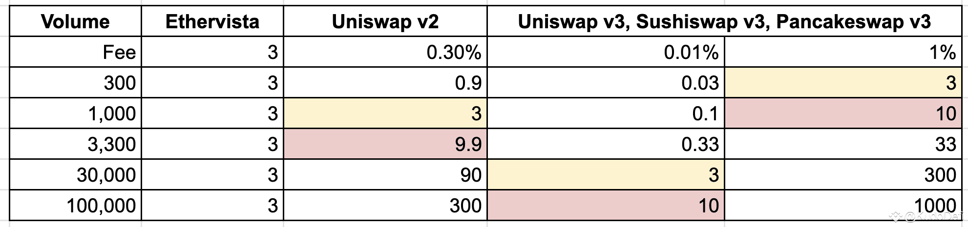 Trong trường hợp tối thiểu, một lệnh swap trên Ethervsita chịu $3 phí, tương ứng với 1.000 USD khối lượng giao dịch trên Uniswap v2 và từ 300-30.000 USD trên v3 tuỳ theo fee tier. Như vậy nếu giao dịch với khối lượng lớn hơn 1.000 USD mà pair đó không có phiên bản v3 thì Ethervista có lợi hơn.