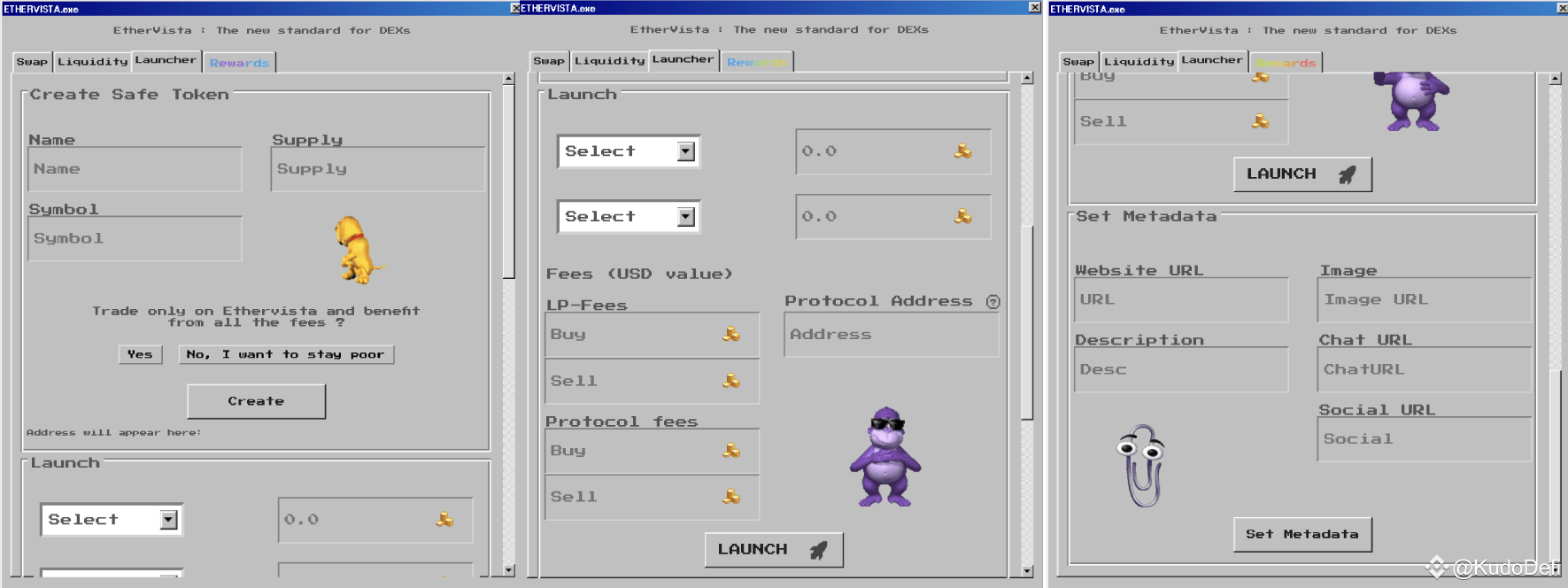 Khác với các nền tảng phát hành memecoin khác, Ethervista không hẳn là fair launch, quá trình phát hành token của nó chia làm 3 bước chính: tạo token, add LP và cuối cùng là cập nhật metadata.