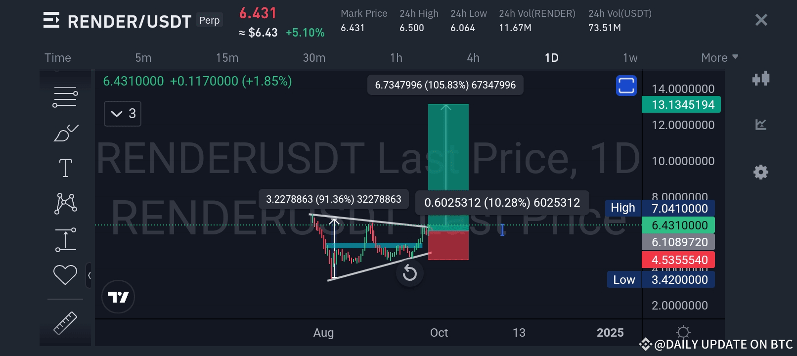 Here’s an exciting setup on the RENDER/USDT pair that has caught my attention. The price is currently sitting at $6.43 with strong bullish momentum. We are seeing a symmetrical triangle breakout, which often leads to powerful upward moves.