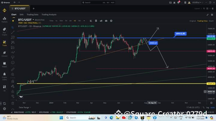 Historically, the Cup and Handle pattern is considered highly bullish, and when confirmed, it can result in a massive price surge. This is particularly true when the price breaks above the resistance that forms the top of the cup—in this case, around the $65,000 to $70,000 zone.