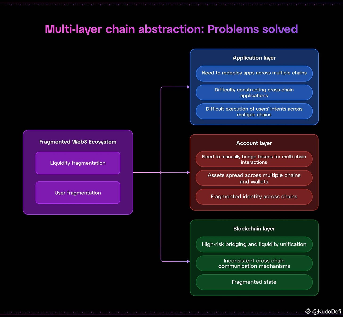 Hai vấn đề lớn mà Chain Abstraction cần giải quyết là Phân mảnh công nghệ và Phân mảnh thanh khoản. Những giải pháp hiện nay đang cố gắng giải quyết một phần hoặc toàn bộ vấn đề trên. Chi tiết hơn, những công việc cần được giải quyết bên dưới lớp ứng dụng bao gồm: