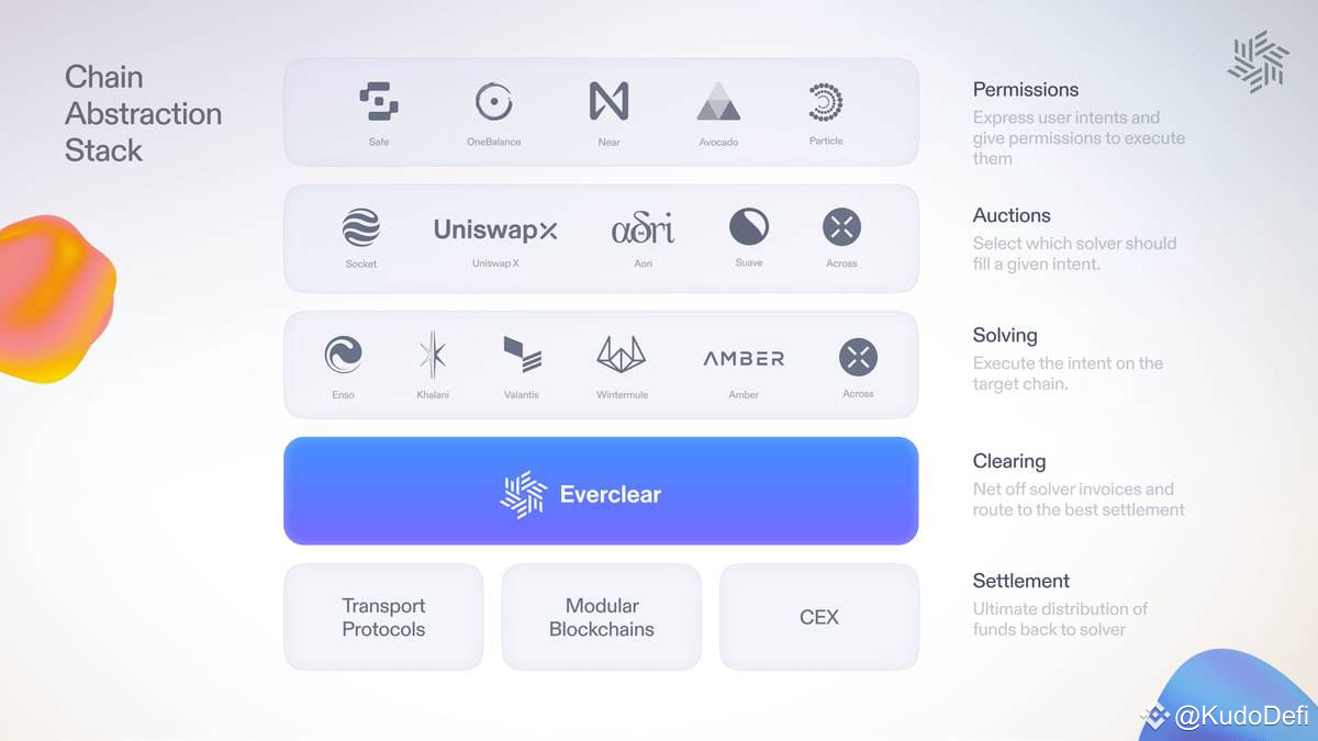 Chain Abstraction Stack của Everclear (Connext cũ) chia nhỏ hơn các lớp và tập trung vào ý định của người dùng. Theo đó có 5 lớp trong mô hình hoạt động: