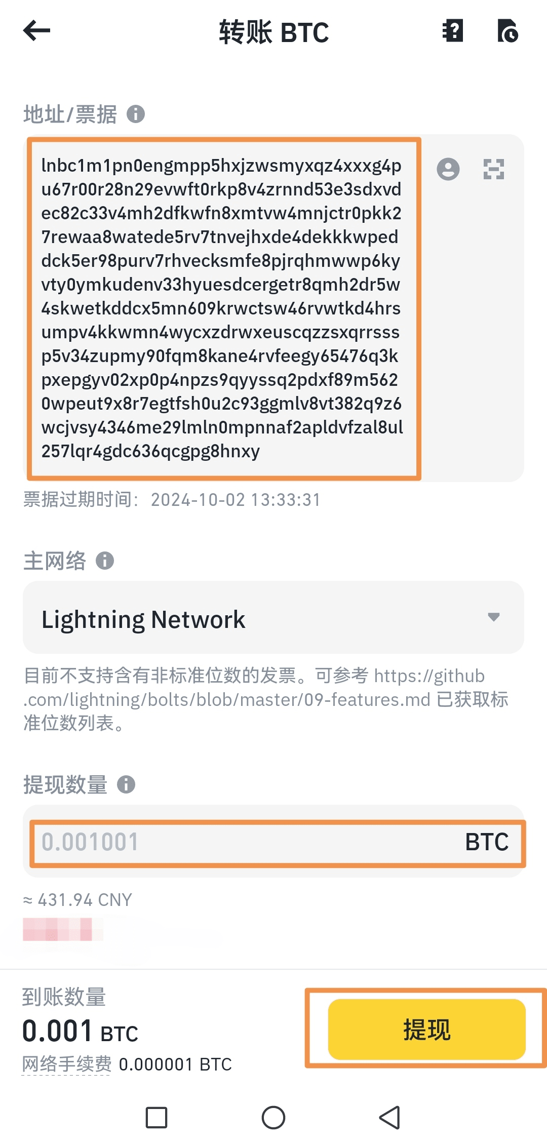 一、首先去binance交易所选择大饼闪电网络地址提现,输入需要提现的大饼数量,如下图会生成票据号码,记得复制下来。