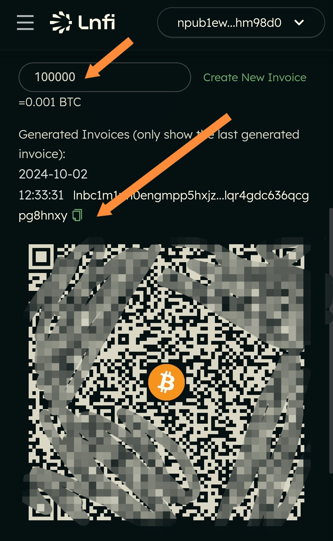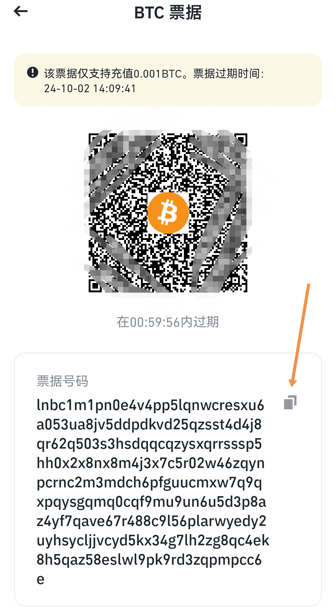 这里生成了一个二维码和 “lnbc1” 开头的文本,我们复制此文本内容。