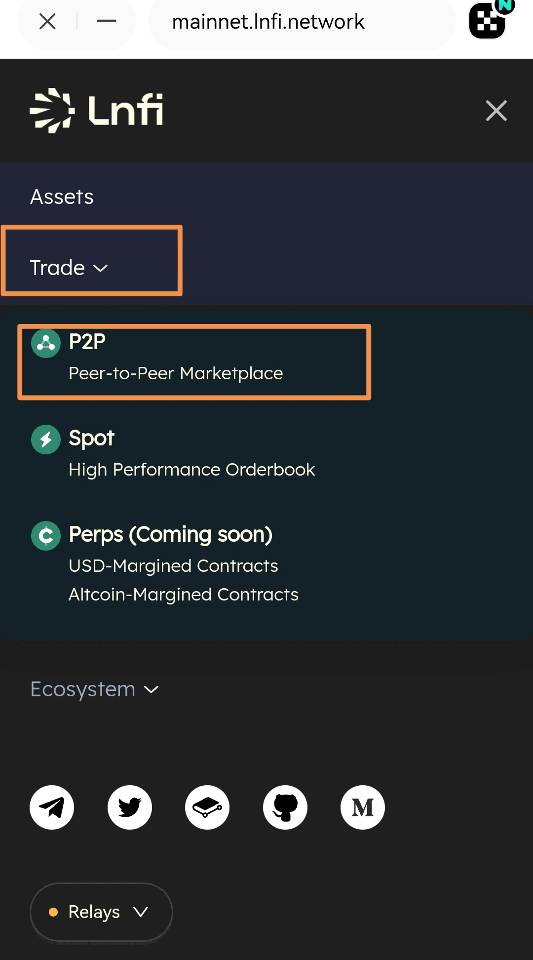 下面以电脑端页面为例,打开 Lnfi 官网:https://mainnet.lnfi.network 并链接钱包,鼠标移动到 “Trade” 上,在出现的菜单中点击:“P2P”,如下所示: