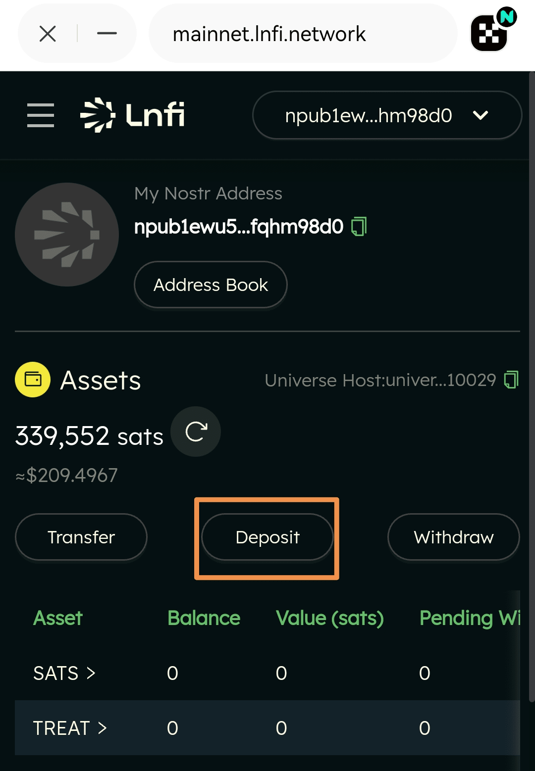 一、我们以Lnfi 官网为例进行操作演示:https://mainnet.lnfi.network 并链接个人OKX钱包地址,平台会在Nostr网络协议下生成唯一对应的npub1开头地址,如下图所示,点击Deposit,中文意思是存款