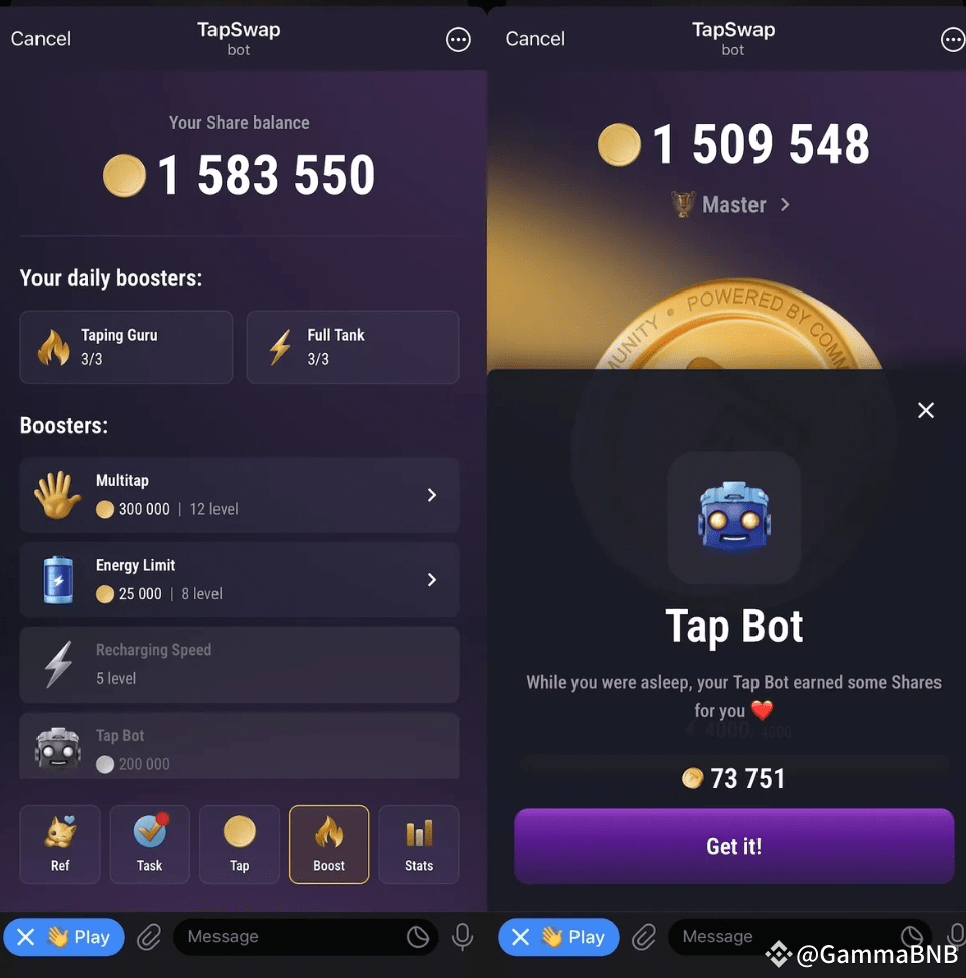 TapSwap also offers boosts. Each day, players receive three free “Tapping Guru” and “Full Tank” boosters. Tapping Guru boosts increase points earned per tap, while Full Tank refills the energy bar, allowing you to tap more.