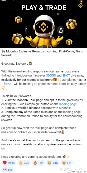At Moonbix, the excitement never stops! Following the incredible response to previous announcements, the platform is launching its first-ever $DOGS and $NOT giveaway, exclusively for its dedicated community of Moonbix explorers. The Moonbix team is thrilled to reward loyal users with these sought-after tokens, while also teasing the grand arrival of $BNB—the planet master—soon to join the reward pool. Whether you’re a seasoned crypto enthusiast or new to the game. the Moonbix Airdrop promises exciting rewards for everyone.
