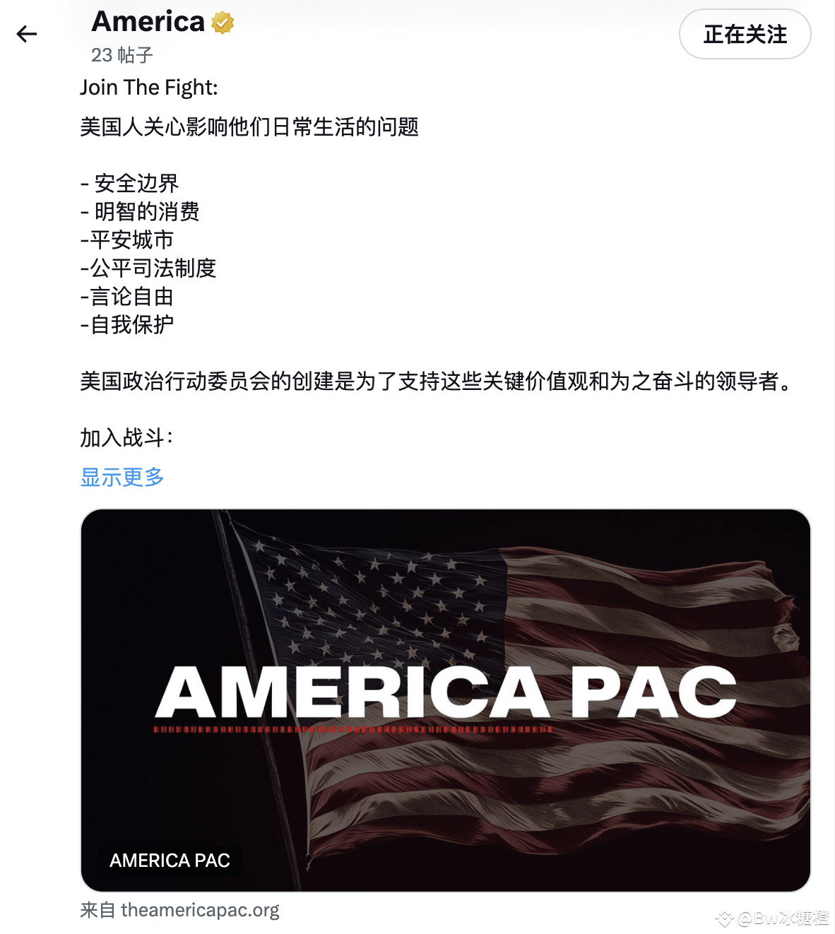 PAC意为,美国政治选举管理委员会,由包括马斯克在内的资金支持,马斯克会通过这个组织向特朗普捐款,从而支持特朗普的竞选,PAC后面有一系列的价值观,即当下的美国梦,政治memecoin