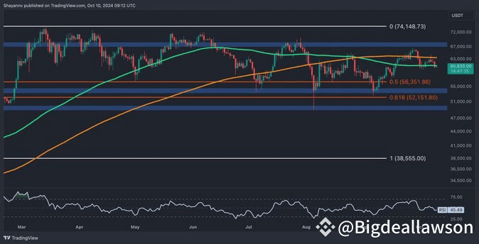 If the price fails to hold the $60K support, the likelihood of a mid-term decline toward the $52K-$55K zone increases.