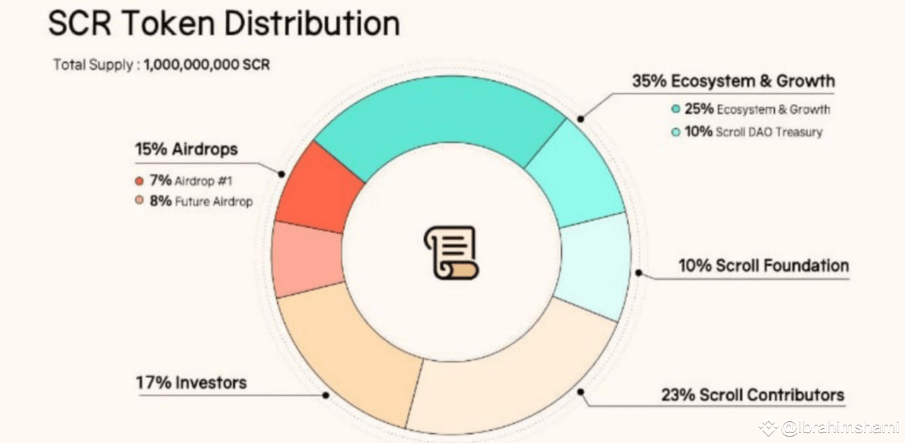 استراتيجية توزيع عملة " SCR " الخاص بمنصة Scroll يتم وفق استراتيجية تهدف لتعزيز النمو ودعم المجتمع والمشاركين في المشروع. إجمالي عدد الرموز هو مليار (1,000,000,000) SCR، ويتم توزيعها كما يلي: