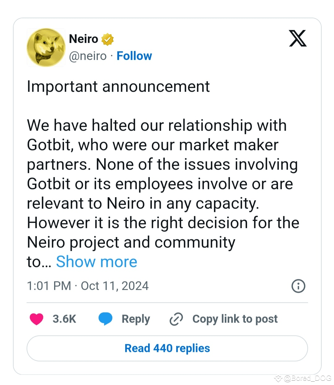 Члены криптосообщества не так быстро приняли заверения Neiro. Например, анонимный ончейн-сыщик ZachXBT вскоре после этого подверг резкой критике Neiro за партнерство с Gotbit до обвинений на этой неделе, несмотря на то, что опасения по поводу маркет-мейкера были общеизвестны уже больше года.