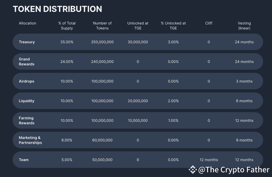 On the other hand, Grand Combat’s vesting plan is well-structured. Even the shortest vesting period—for the 10% airdrop—is three months, with the longest vesting period stretching to 24 months for the treasury and Grand Rewards.