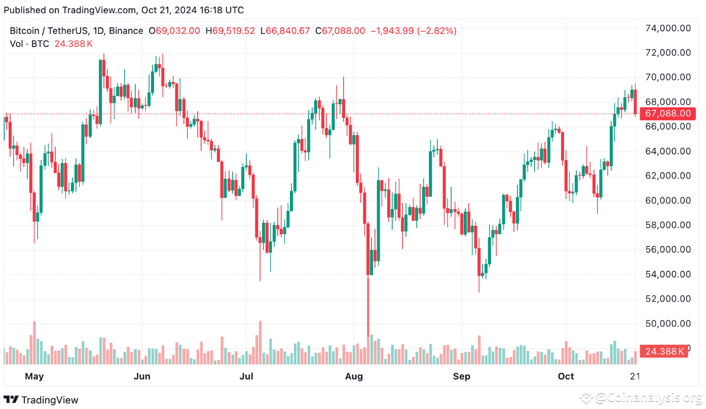 Bitcoin has been on a steady upward trajectory throughout October, affectionately dubbed "Uptober" by the crypto community. As of October 21, BTC is trading at $67,100, a 3-month high and a level not seen since late July. Just days ago, Bitcoin briefly surged to $69,500 before retreating as sellers entered the market, slowing the momentum.
