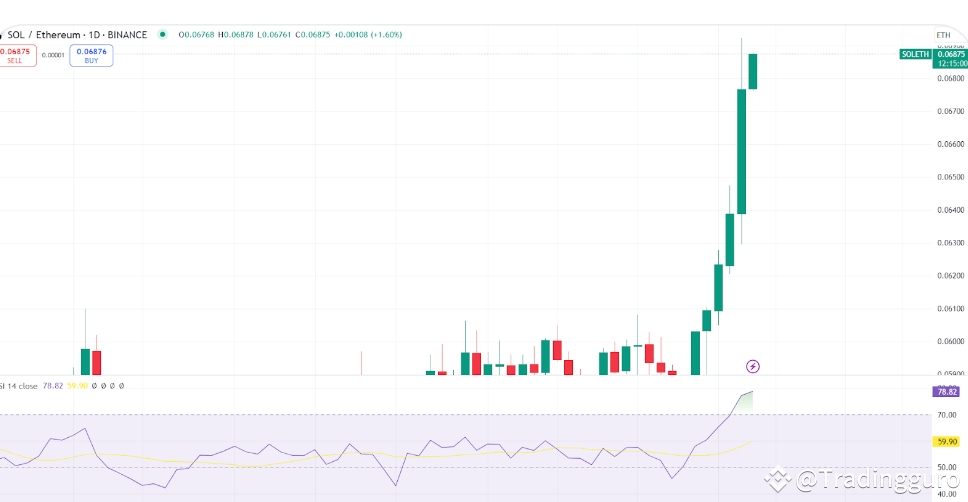 The RSI indicator for the SOL/ETH pair on the daily chart is now at 78.17, entering the overbought zone. Traditionally, this signals a potential price correction, although it does not guarantee an imminent pullback. It may suggest that the market could cool down before continuing its upward trajectory.