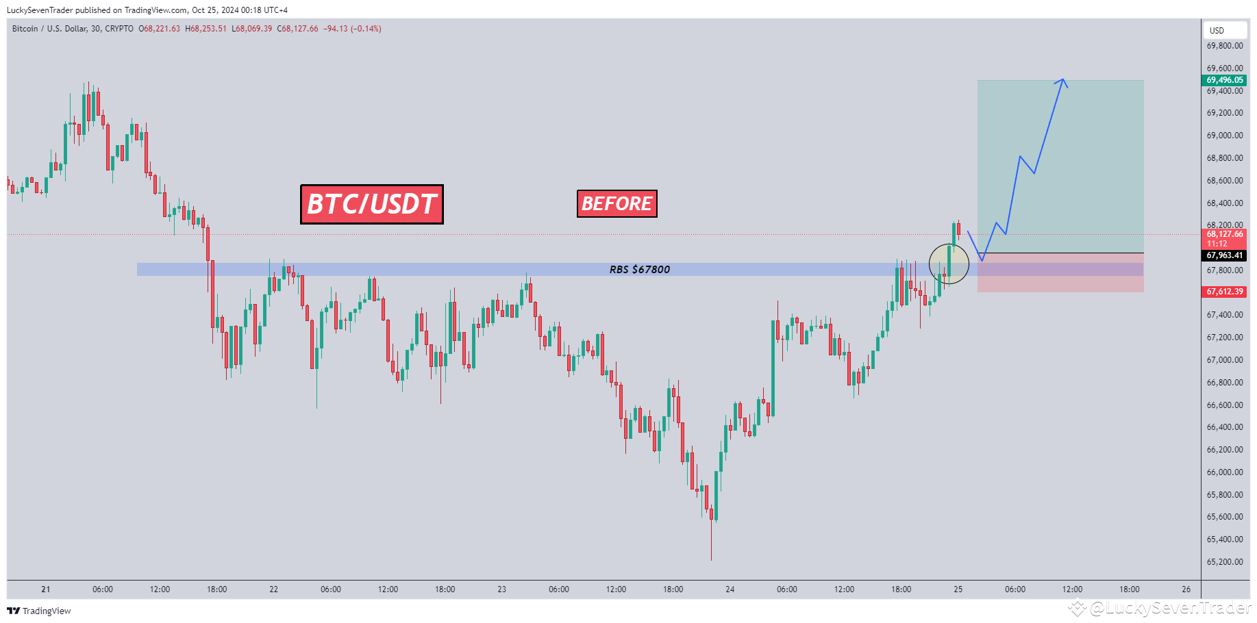 In the 30-minute timeframe, #Bitcoin❗ has broken through the $67,800 resistance, which has now turned into support. This presents a great opportunity for a scalping or short-term long trade. As the price retests this new support, here's a potential setup for a quick profit: