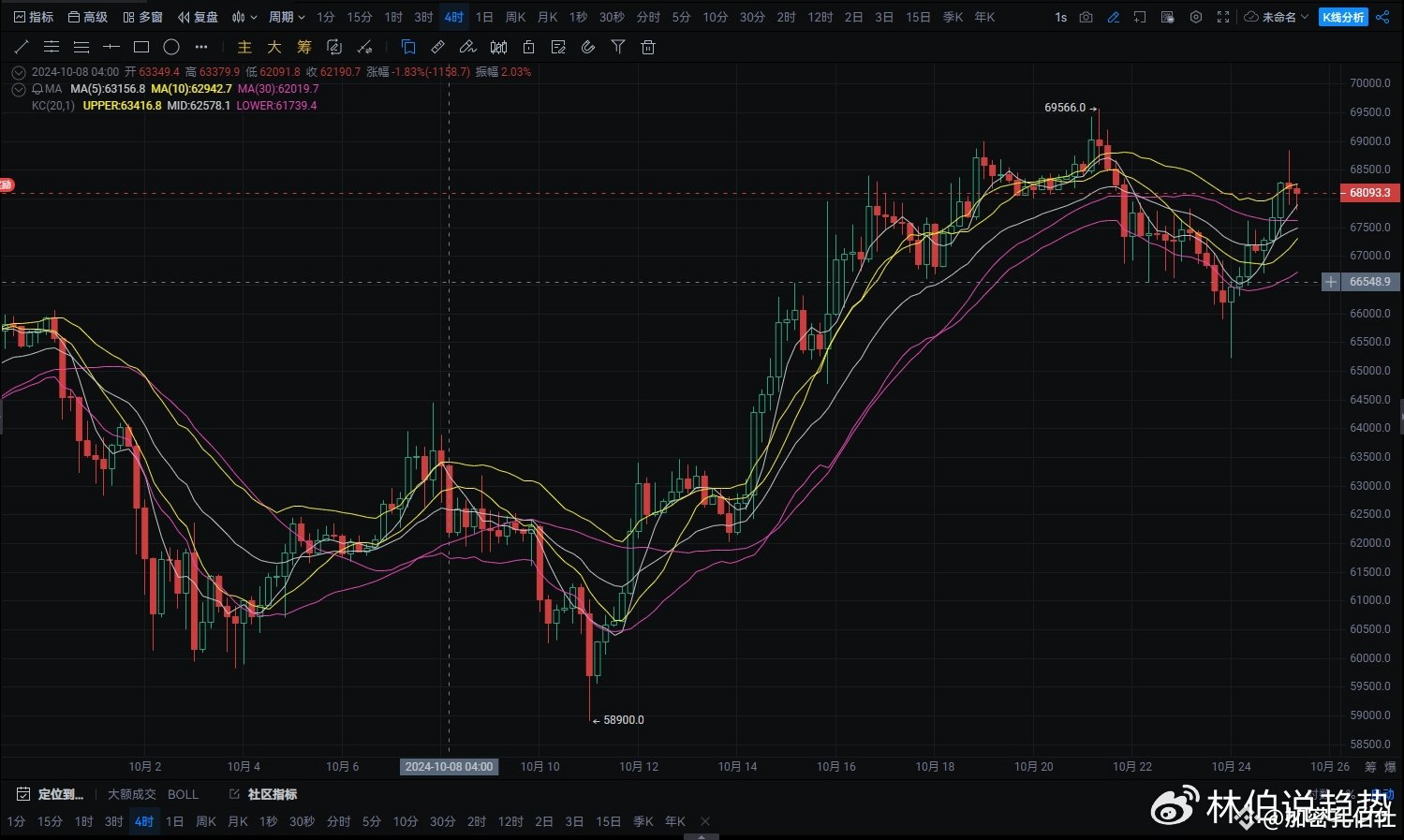 4小时k线图多方在昨日尝试突破69000点位失败后,抛压明显,导致价格回落至68000一线。当前价格正在尝试站稳在主要支撑位附近,而整体趋势仍有待进一步确认。