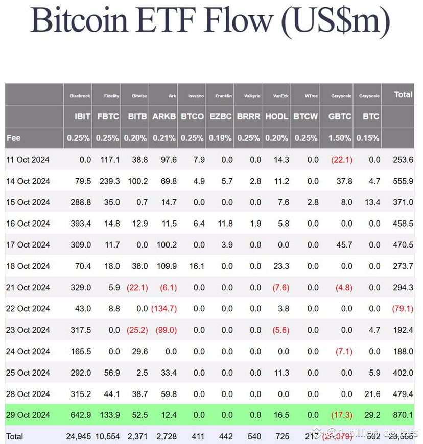 Theo dữ liệu từ Farside investors, các quỹ BTC ETF đã chứng kiến dòng vốn vào lên tới 870 triệu USD trong phiên giao dịch ngày 29/10. Lực mua chính tiếp tục đến từ quỹ IBIT của ông lớn BlackRock với gần 643 triệu USD (con số lớn nhất trong 7 tháng qua), trong khi không có bất kỳ quỹ nào bị rút ròng.