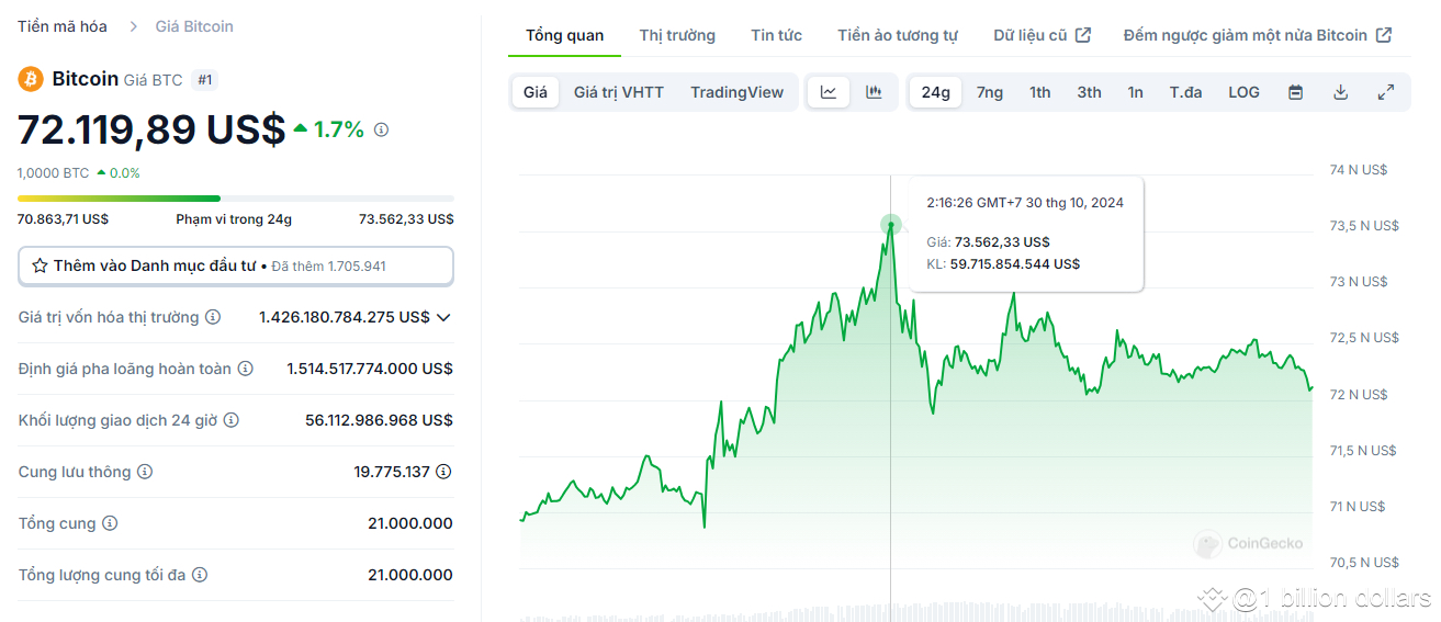 Dù vậy, đà tăng của BTC đã có dấu hiệu hạ nhiệt nhất định sau khi tăng nóng những ngày qua. Tính đến thời điểm viết bài, giá BTC hiện đang giao dịch quanh mốc 72.100 USD - giảm hơn 2% từ mức giá cao nhất trong ngày.