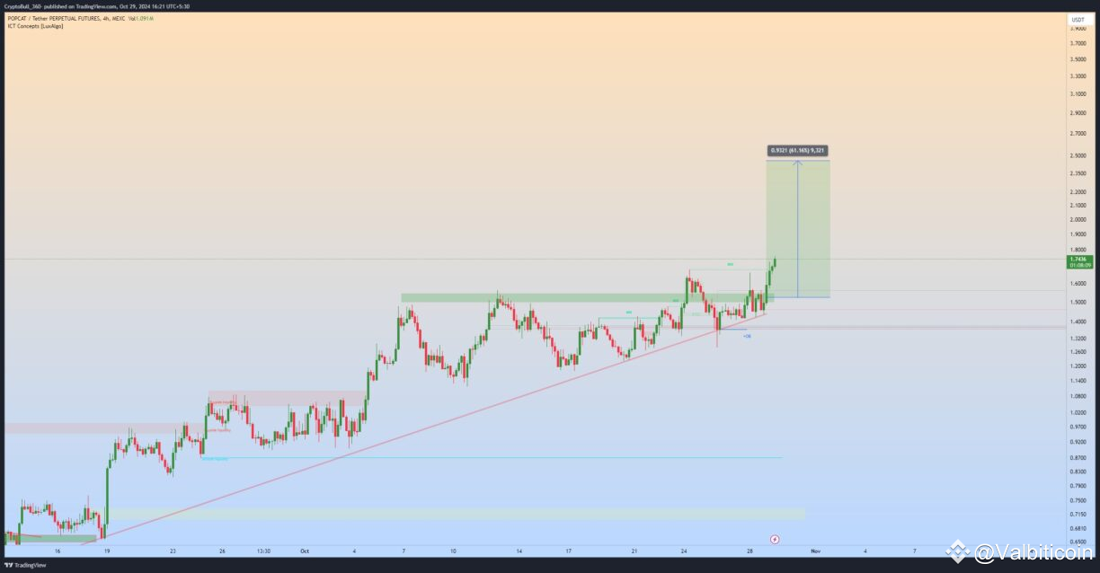 O analista de criptomoedas no X observa que o POPCAT está progredindo constantemente em direção à marca esperada de $2,5. Após uma quebra bem-sucedida de um padrão de cunha ascendente, o token mostra um forte momentum ascendente, apoiado por um aumento de volume.