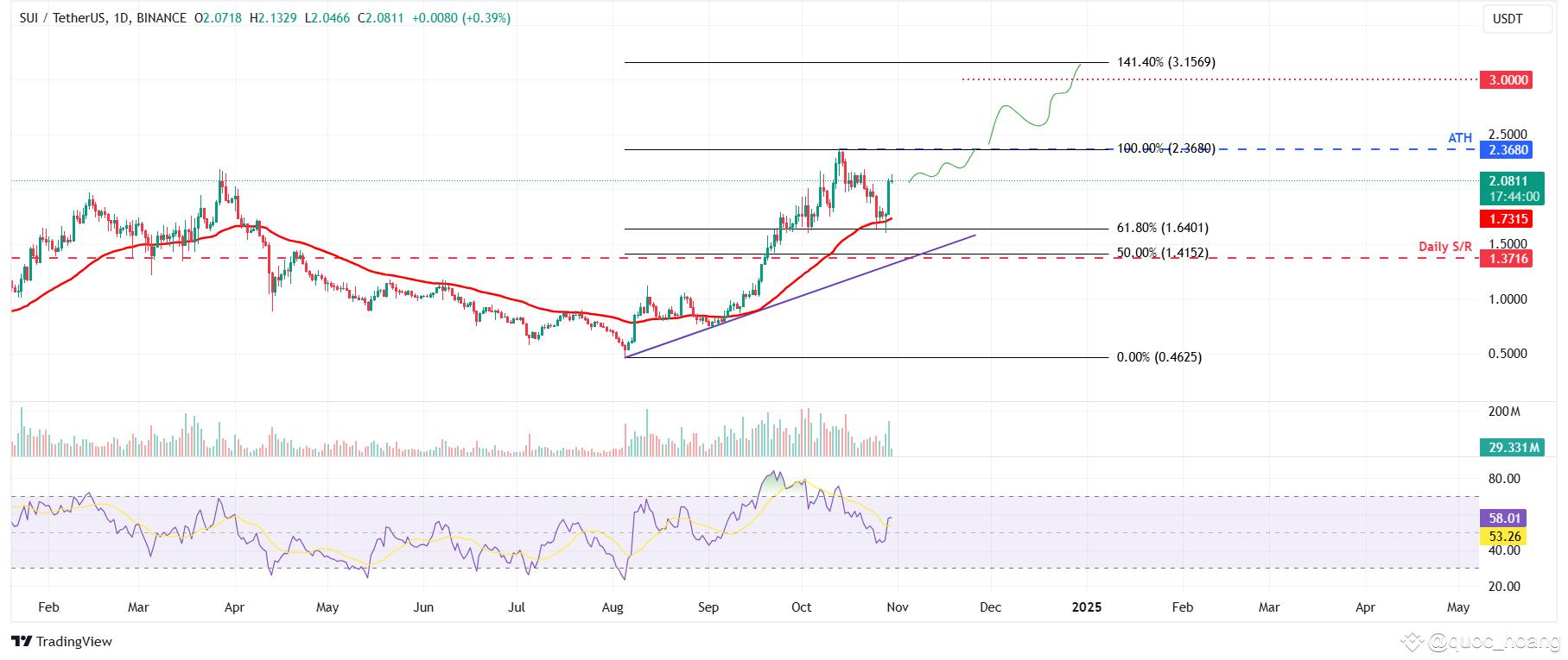 Nếu SUI duy trì đà tăng, giá có thể sớm kiểm tra lại rào cản quan trọng tiếp theo là $2,36, thiết lập ATH mới. Đóng cửa thành công trên mức này có thể mở đường cho SUI hướng đến mức mở rộng Fibonacci 141,4% tại $3,15. Tuy nhiên, trader có thể chọn chốt lời quanh mức quan trọng về mặt tâm lý là $3.