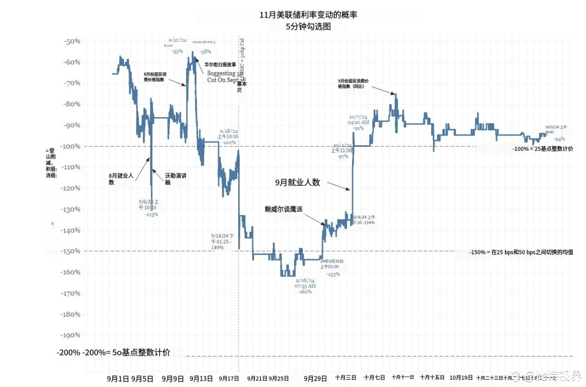 8.美国九月裁员人数下降,从7月份到开始呈下降趋势,此外根据图表显示,在下周的 #fomc 会议(11月7日)再次降息25BP有94%的可能性(图2)