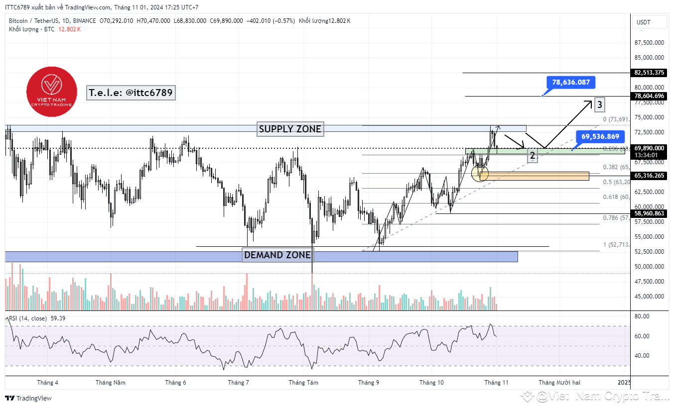 Sang đến ngày hôm nay tiếp tục xuất hiện áp lực bán, đã có lúc phe Gấu đẩy giá xuống $68.830 nhưng ngay sau đó đã bật lên. Dự kiến giá sẽ giao động quanh zone $68k - 70k trong vài ngày tới, vừa là tích lũy vừa đợi tin tức bầu cử. Nếu ông Trump đắc cử, nhiều khả năng chúng ta sẽ có new ATH.