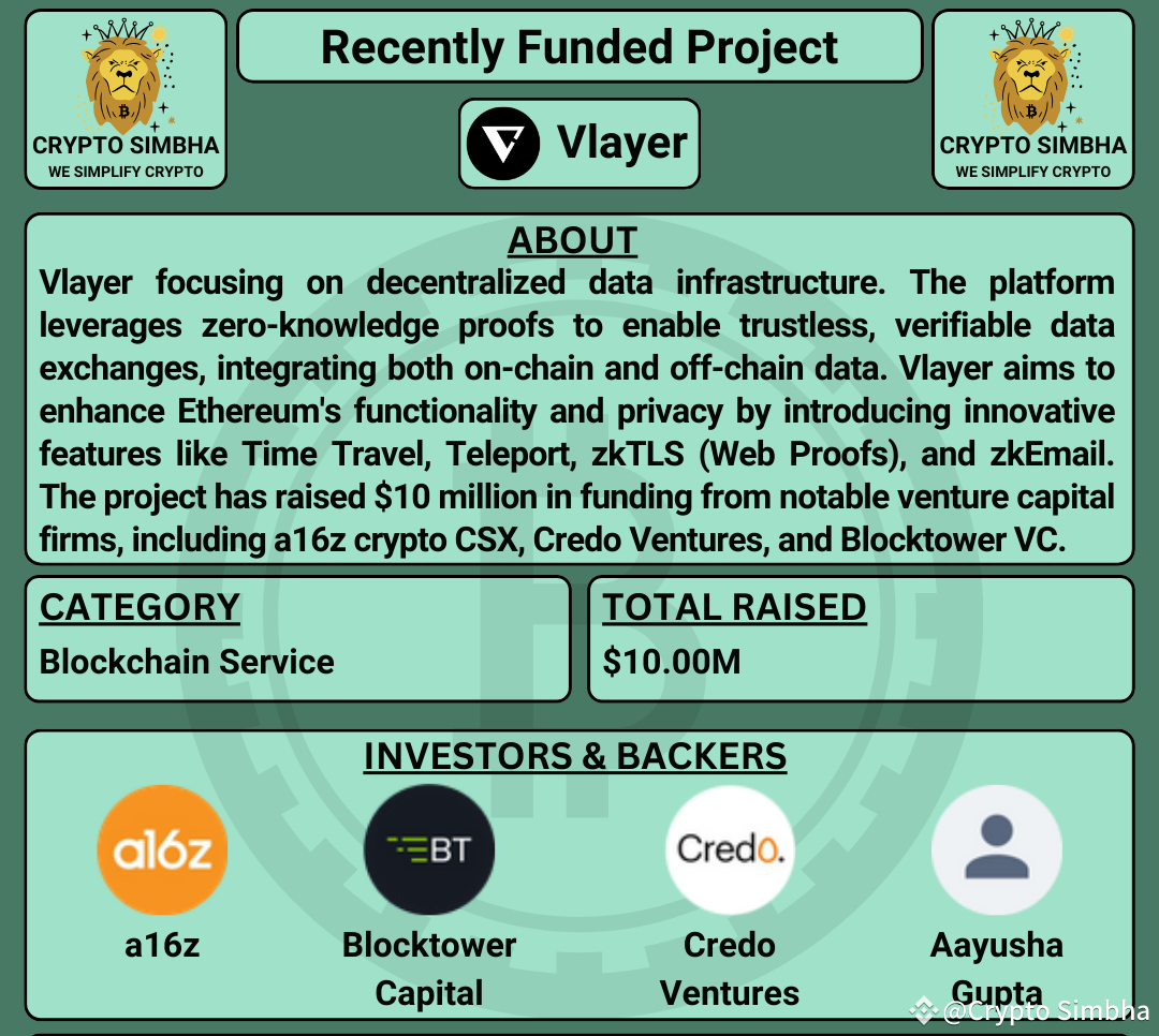 🔹About: Vlayer focusing on decentralized data infrastructure. The platform leverages zero-knowledge proofs to enable trustless, verifiable data exchanges, integrating both on-chain and off-chain data. Vlayer aims to enhance Ethereum's functionality and privacy by introducing innovative features like Time Travel, Teleport, zkTLS (Web Proofs), and zkEmail. The project has raised $10 million in funding from notable venture capital firms, including a16z crypto CSX, Credo Ventures, and Blocktower VC. Headquartered in Warsaw, Poland, Vlayer is committed to revolutionizing data interaction within smart contracts, making it more secure and efficient. 🚀🌐