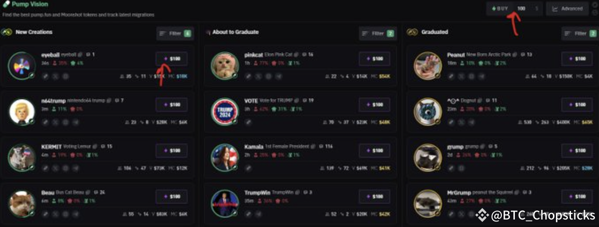 进入BullX后,找到“Pump Vision”功能,可以快速浏览PumpFun中的新迷因。注意,在迷因“毕业”前(即市值达到$69K)快速卖出是最佳策略——否则,很可能会出现快速暴跌。