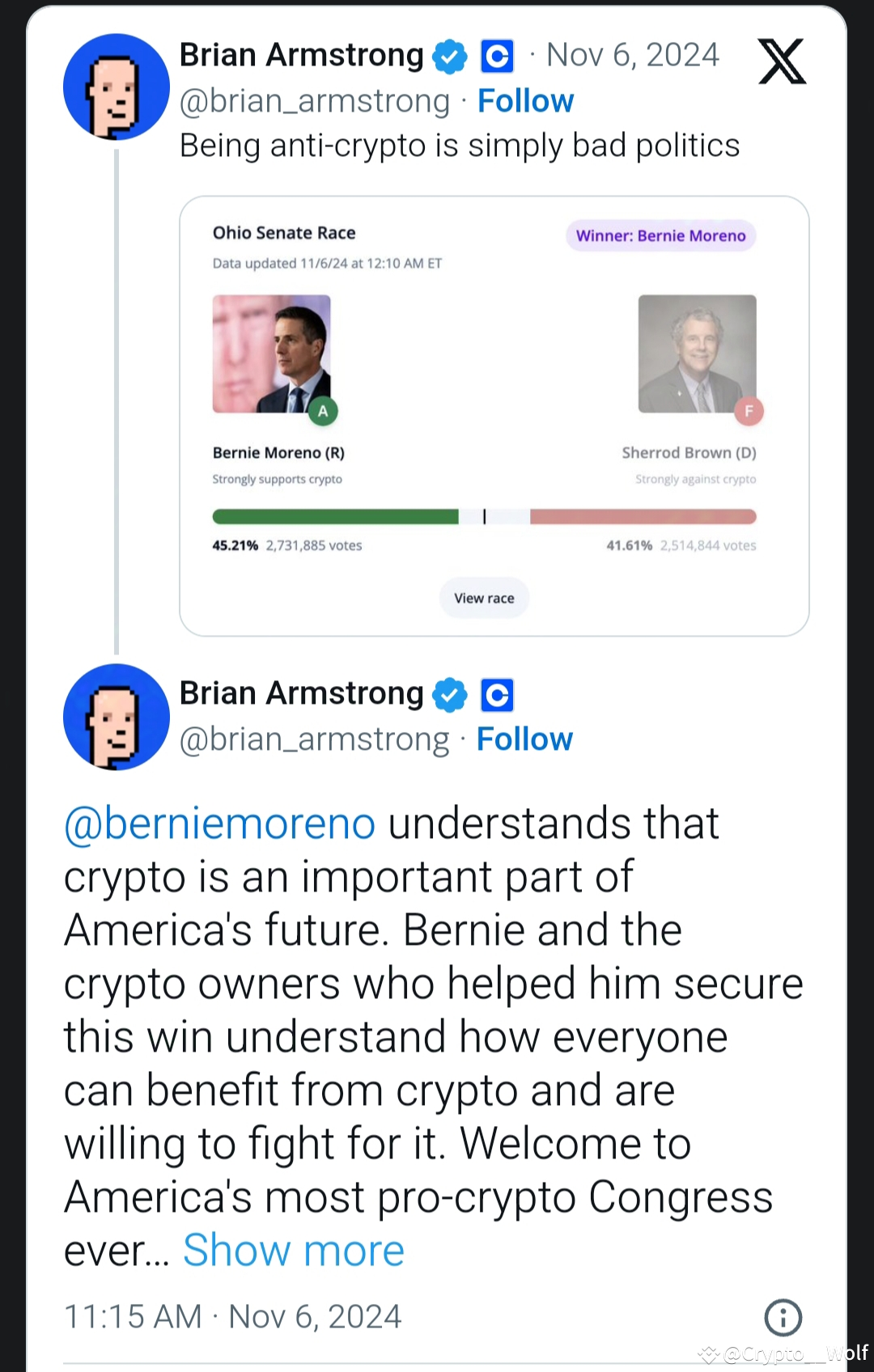 Crypto community including Coinbase CEO Brian Armstrong noted that Bernie Moreno’s win kicked out crypto enemy number 2 in the Senate, Sherrod Brown, in Ohio.