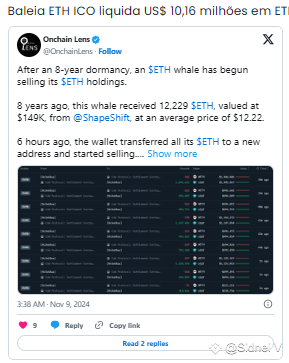 Uma carteira de baleias que se acredita ter participado da oferta inicial de moedas da ETH começou a liquidar participações em ETH após 8 anos de dormência. Embora a carteira tenha liquidado uma quantidade substancial de suas participações em ETH, a baleia ainda detém uma quantidade significativa de $ETH .