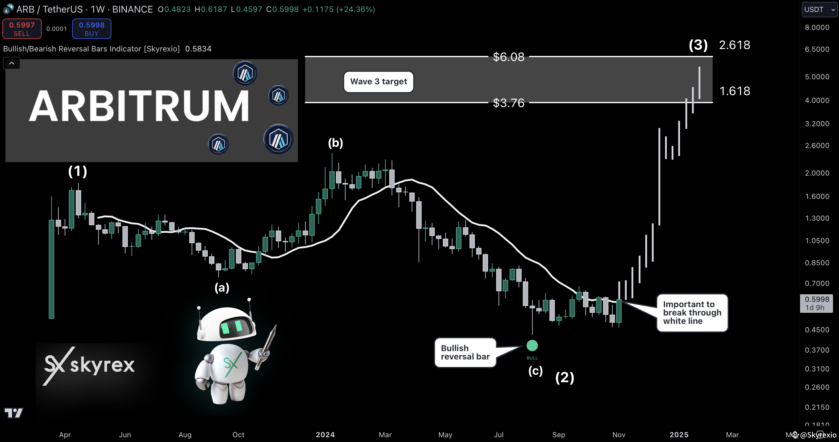 As we can see the wave C inside 2 has been finished already with the bullish reversal bar on the Bullish/Bearish Reversal Bars Indicator [Skyrexio]. This bar is marked with the green dot. This is potentially very strong reversal sign, high chance to start the bullish phase from now. It's very important to break through the white line, the lips of Williams Alligator indicator and find support above it to trigger the increase. If this happens the next wave is wave 3 has the target area between $3.76 and $6.08. We assume that this target is going to be reached in 2025.