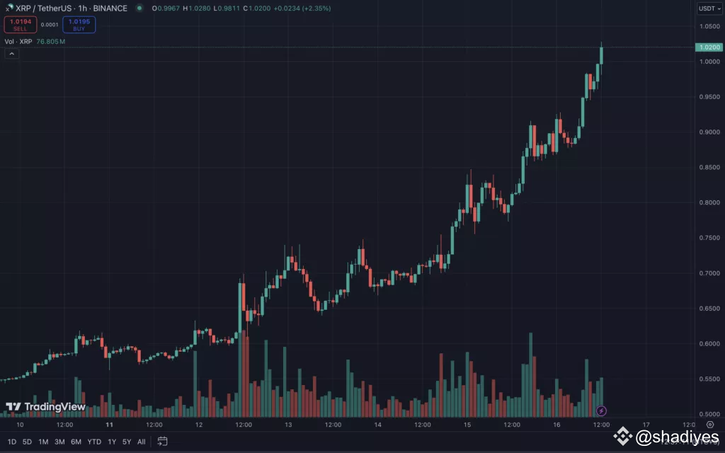 В субботу, 16 ноября, котировки токена XRP превысили психологический рубеж в $1 впервые с декабря 2021 года.На момент написания XRP торгуется по $1,02, прибавив 83,8% за последнюю неделю.