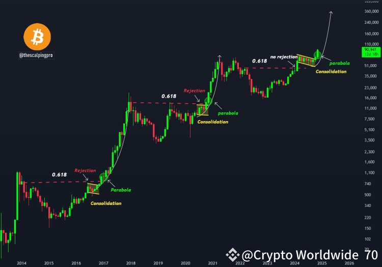 Following Bitcoin’s move to the 0.618 Fibonacci level, Mags has analyzed the optimistic development with previous occurrences, prompting his claims that BTC is about to go parabolic. During each cycle, the expert highlighted that before breaking out and going parabolic, the price of BTC always encounters a monthly rejection and consolidation below the 0.618 Fibonacci level, which often acts as a strong resistance area.
