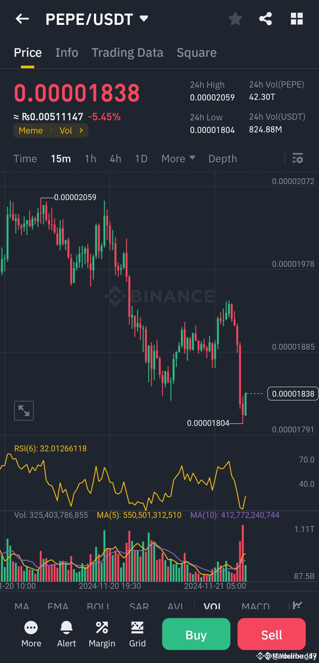 A spike in trading volume occurred around the recent low of 0.00001804, suggesting strong interest or possible accumulation. This might indicate a reversal or the start of a consolidation phase.