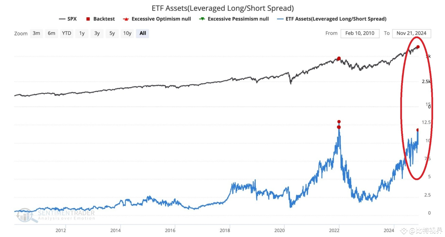 3.根据Sentimentrader数据,每投资1美元美国杠杆空头的ETF就有近12美元投资于杠杆多头ETF,这可是14年来的第二高水平(图1)