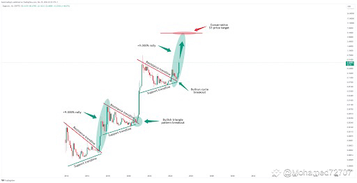 In a TradingView post, Philip said that the Dogecoin price rally is still in its early stages. Analyzing DOGE’s monthly chart, the analyst noted that the foremost meme coin is still close to the bottom of the cycle and is expected to keep trending upward. He then alluded to a triangle pattern, in which Dogecoin trades within every cycle before it enjoys a parabolic price breakout.