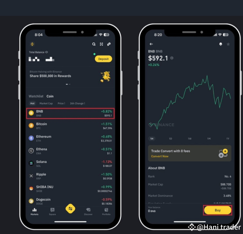 Click on the cryptocurrency you want to buy. Let's say you want to buy BNB. Click on BNB, a page will appear on which you will see a simple BNB trend chart, the current price, and coin specifics.