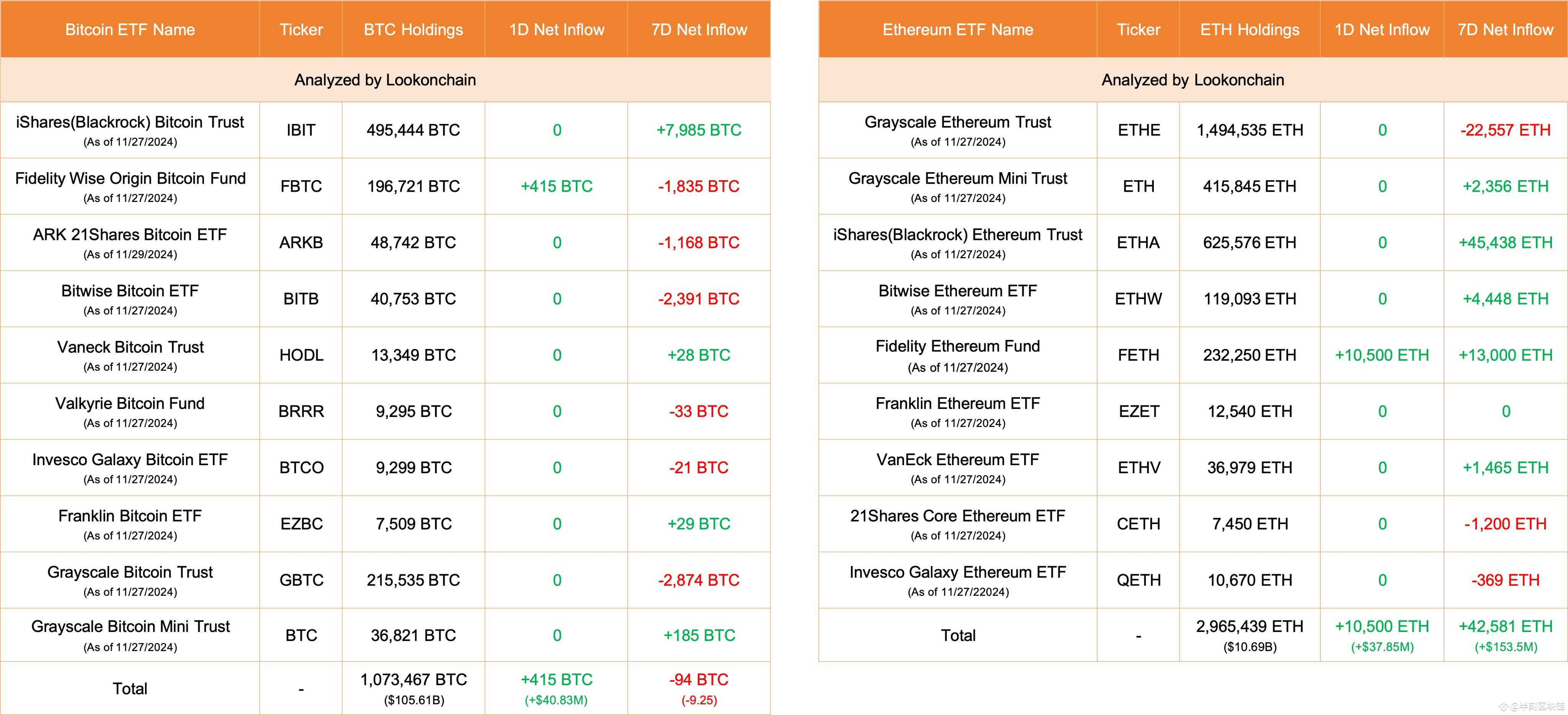 10 个#Bitcoin ETF 净流量:415 $BTC(4083 万美元)
