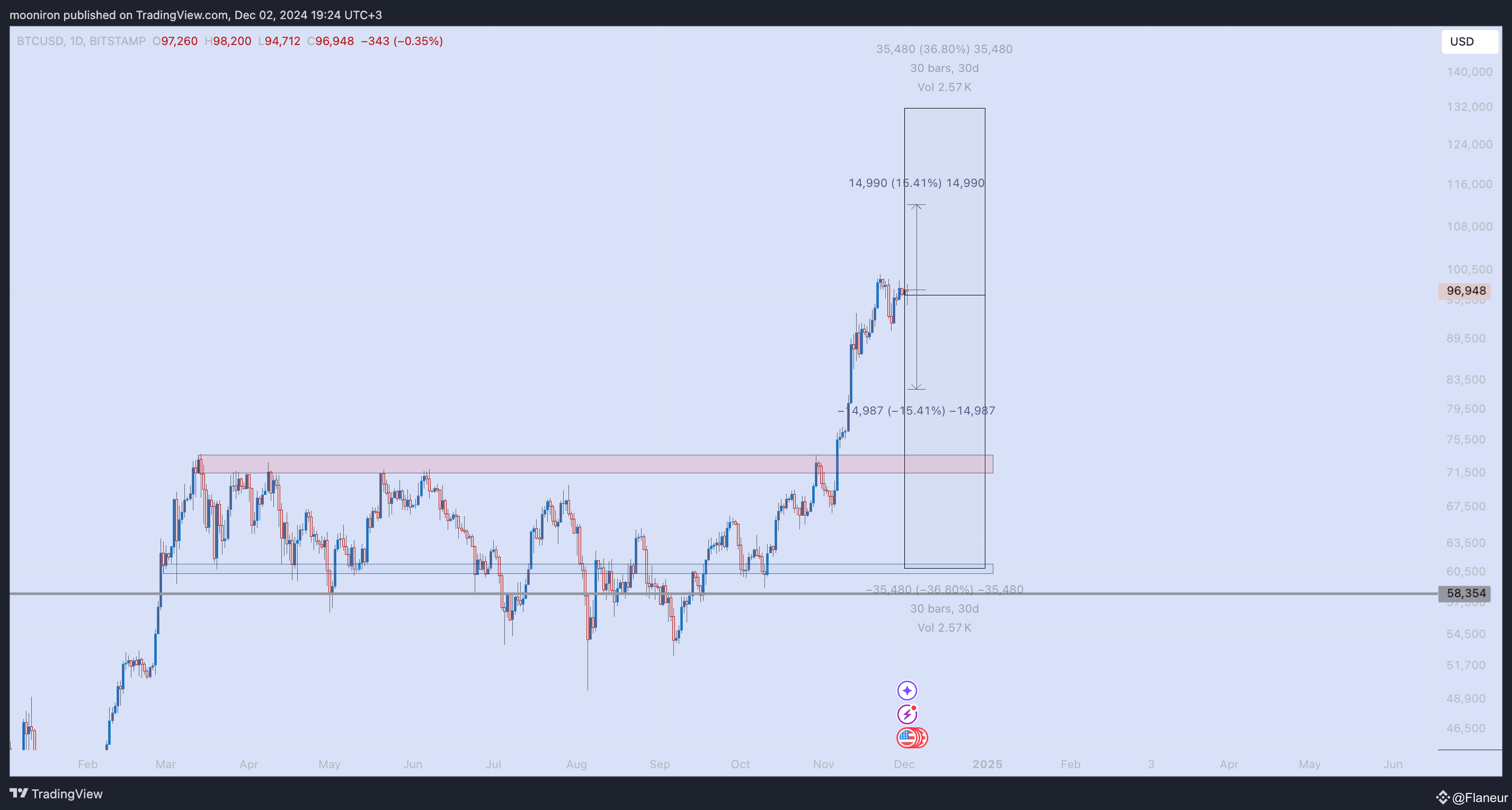It opened December at $96,500, and we can forecast monthly implied volatility around 37% and weekly at 15.4%. This shows us a monthly range of 61k to 132k, and weekly range of 82.5k to 112k. I think the 87k band will act as a pivot zone, with the 78k region serving as support below.