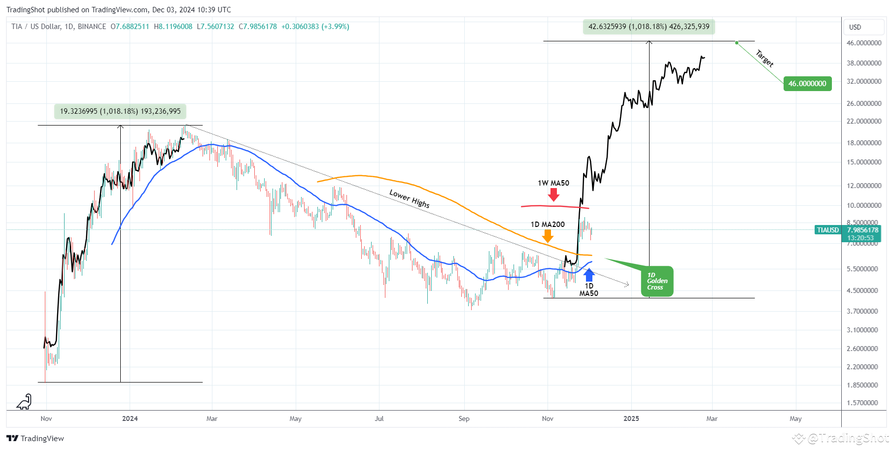 Celestia (TIAUSD) is ahead of its first 1D Golden Cross in history, which should have been completed by next Monday the latest. Having broken above the Lower Highs trend-line that has dominated the majority of 2024, the only technical obstacle now is the 1W MA50 (red trend-line).