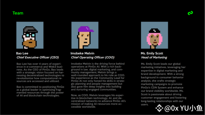 从 PinGo 官方文档来看,PinGo 核心团队在社区和营销方面有丰富的经验。大多数人对 AI 项目的误解点在于核心团队需要有丰富的技术能力,但事实上最核心的 AI 技术是由少数极具天赋的天才完成的,而在应用层面来说,AI 产品的运营方需要有足够的能力让产品被更多人熟知被更多人使用。PinGo 目前的团队配置完美展现了其在运营方面的能力。