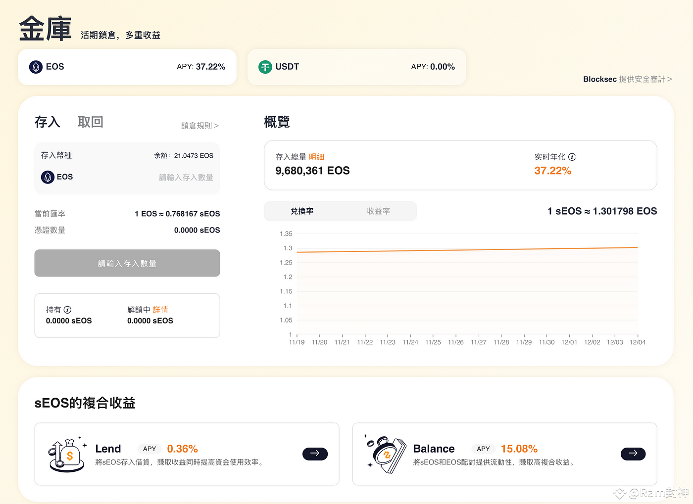 Defibox的金库经过严格安全审计+多签+代码定向开源,安全系数接近DAOBOX的“0”风险,稳定运行了3年,是EOS上唯一的生息代币。它的特点是享受高年化30%的同时,拥有SEOS代币,作为流动性,可以参与做市、借贷、抵押物等等DeFi权益,是不少大户和专业交易员的选择。作为普通用户来说,单单参与金库享受高年化也是不错的选择。